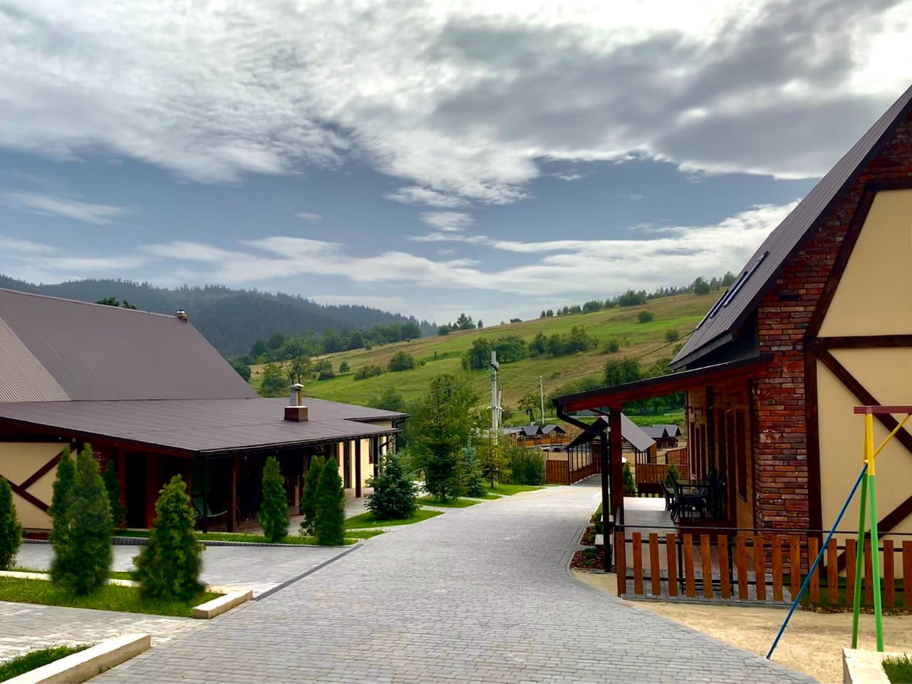 центральна стежка, ліворуч від якої знаходиться 2 котеджі із